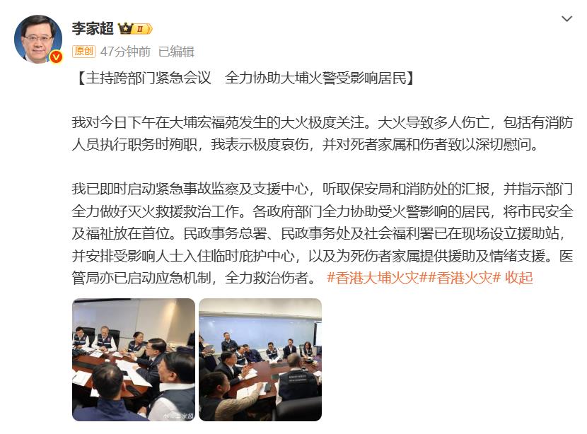 李家超主持跨部门紧急会议 全力协助大埔火警受影响居民